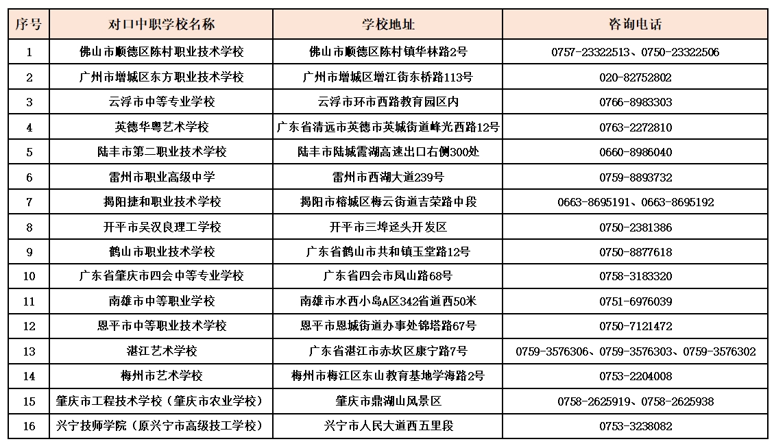 根据《广东省教育厅 广东省招生委员会办公室关于开展2024年职业院校中高职贯通培养三二分段试点工作的通知》(粤教职函〔2024〕21号),我校学前教育专业与佛山市顺德区陈村职业技术学校、广州市增城区东方职业技术学校、云浮市中等专业学校、英德华粤艺术学校、陆丰市第二职业技术学校、雷州市职业高级中学、揭阳捷和职业技术学校、开平市吴汉良理工学校、鹤山市职业技术学校、广东省肇庆市四会中等专业学校、南雄市中等职业学校、恩平市中等职业技术学校、湛江艺术学校、梅州市艺术学校、肇庆市工程技术学校(肇庆市农业学校)以上学校对口幼儿保育专业,与兴宁技师学院(原兴宁市高级技工学校)对口幼儿教育专业等16所学校开展2024年中高职贯通培养三二分段试点工作。为方便考生了解相关的招生信息,现将我校与对口中职阶段学校的招生专业及计划公布如下: